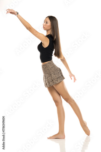 Fototapeta premium Studio shot of tall young ballerina with long brown hair in black top and leopard mini skirt posing with extended arm standing full foot on white background.