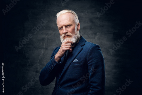 Fototapeta premium Studio shot of thoughtful senior man with stylish hairstyle dressed in blue suit against dark background.