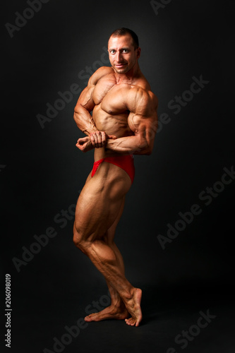 Fototapeta premium Studio shot of young male bodybuilder posing, showing side biceps and chest...