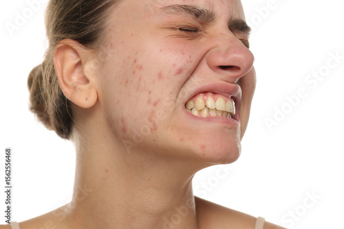 Obraz premium Studio shot of young woman with acne-prone skin, showing emotional distress, on white background