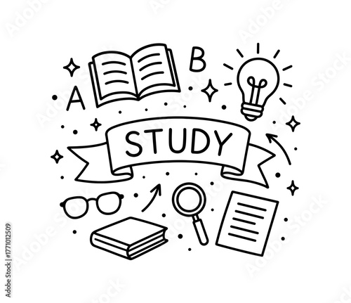 Fototapeta premium Study concept with open book, light bulb, and icons in doodle style
