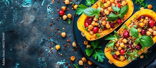Fototapeta premium Stuffed butternut squash with chickpeas, cranberries, quinoa cooked in...