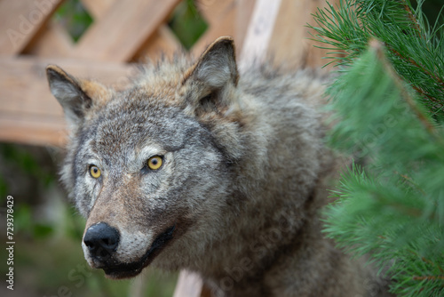 © Светлана Лазаренко, Naklejka premium Stuffed wolf against a green background. Animal taxidermy.