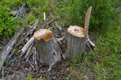 © Evgeniy, Obraz premium Stump on the green grass in the forest. Fresh stump.
