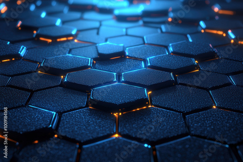 © Petzhy, Obraz premium stunning abstract 3D rendering of hexagonal patterns illuminated with blue and orange lights, creating futuristic and dynamic visual effect. intricate design evokes sense of depth and technology