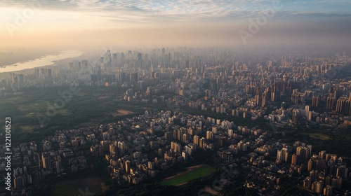 © Mirtiza, Fototapeta premium Stunning Aerial View of a Bustling Coastal City Showcasing Skyscrapers, Waterfront, and Vibrant Skyline During Late Afternoon
