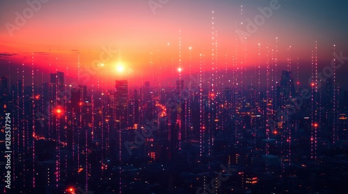 © Nina, Fototapeta premium Stunning Aerial View of a Futuristic Urban Skyline at Sunset with Colorful Light Displays and Data Streams Over an Expansive Cityscape