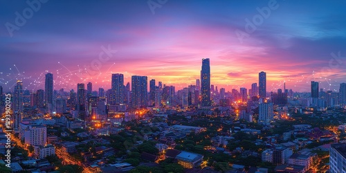 Obraz premium Stunning Aerial View of a Modern City Skyline at Sunset with Vibrant Colors...