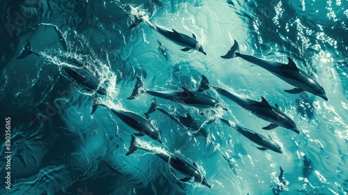 © Matcha_09, Fototapeta premium Stunning aerial view of a pod of dolphins swimming in formation, creating intricate patterns beneath the ocean surface