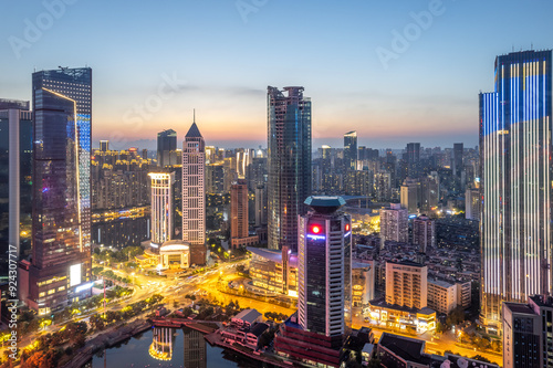 © zhouyilu, Fototapeta premium Stunning Aerial View of a Vibrant City Skyline at Sunset