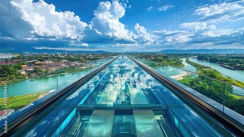 © Nuttaya Nampai, Fototapeta premium Stunning Aerial View of City River and Blue Sky with Clouds