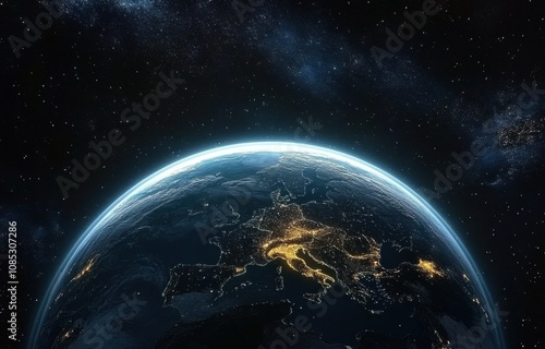 © OnuTH, Obraz premium Stunning Aerial View of Earth at Night Showcasing Continent of Europe with Twinkling City Lights, Space Background and Starry Sky