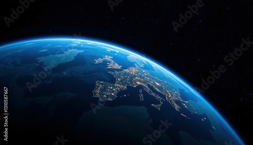 © Kitta Studio, Fototapeta premium Stunning Aerial View of Europe at Night with City Lights and Ocean