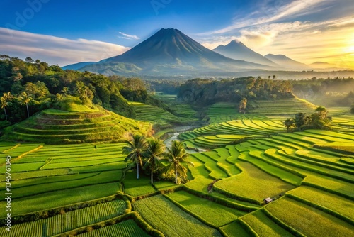 © Adisorn, Obraz premium Stunning Aerial View of Indonesian Landscape: Lush Rice Terraces and Volcanic Peaks