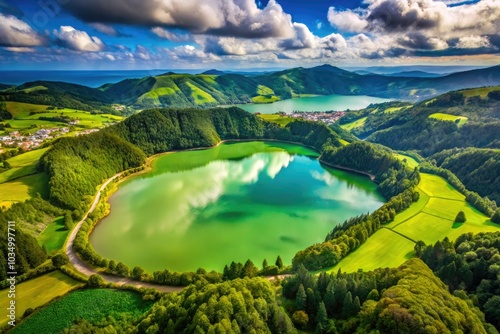 Fototapeta premium Stunning aerial view of Lagoa das Furnas, a serene lake nestled within a...