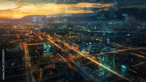 © Worakit, Obraz premium stunning aerial view of modern cityscape illuminated by vibrant lights, showcasing advanced digital platforms and urban infrastructure. sunset casts warm glow over bustling metropolis, highlighting