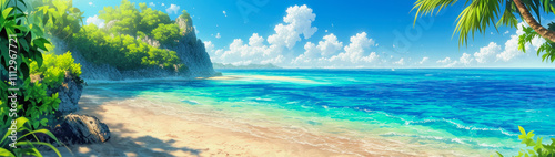 Obraz premium Stunning anime beach with vibrant water and lush greenery under a clear sky....