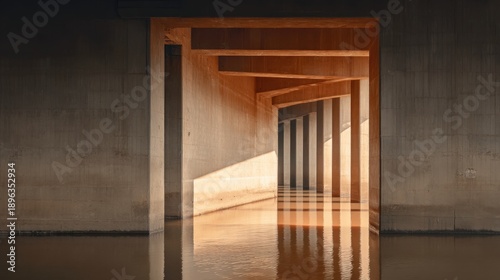 © 69, Obraz premium Stunning Architectural Photo of Concrete Structure with Natural Light Reflections Over Calm Water Surface