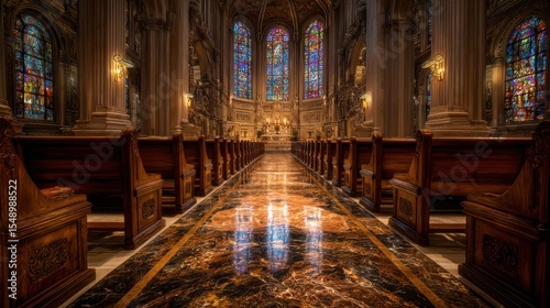 © Ilona, Fototapeta premium Stunning architecture showcases colorful stained glass windows illuminating polished marble flooring in this historic church interior, inviting reflection and serenity within the sacred space