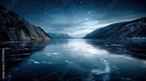 © Artem, Naklejka premium Stunning Arctic landscape under a starry night sky with icy waters and towering cliffs