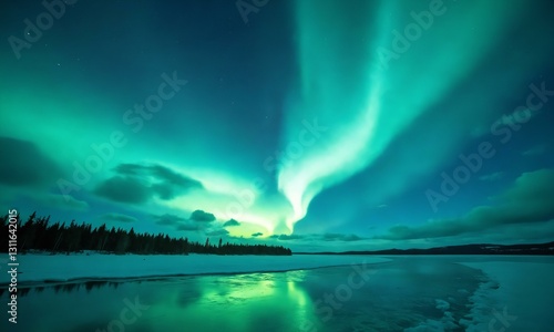 © Arnate, Naklejka premium Stunning Arctic night, aurora swirls across the sky, icy lake reflecting the glowing northern lights.