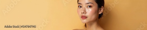 © Phennapha, Obraz premium Stunning Asian model posing in natural light with flawless skin and glowing complexion on beige background, radiant glow , model