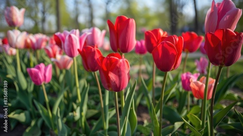 Fototapeta premium Stunning assortment of red and pink tulip flowers blooming in an outdoor park
