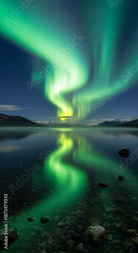 Naklejka premium Stunning Aurora Borealis Display Over Calm Lake Reflecting Vibrant Colors.