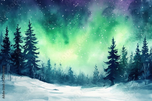 © Anat art, Fototapeta premium Stunning aurora borealis lights up a snowy landscape under a starry sky in winter. Generative AI