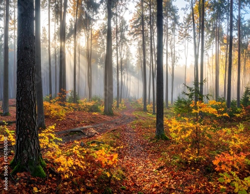 © Somad, Obraz premium Stunning autumn forest landscape with sunlight streaming through the trees