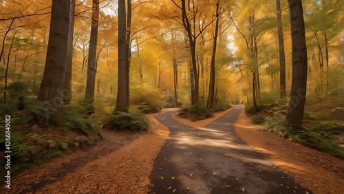 © Naiem, Naklejka premium Stunning Autumn Forest Pathway with Vibrant Fall Foliage