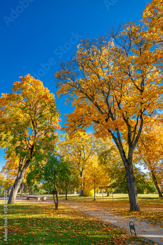 Naklejka premium Stunning autumn park scene with golden trees creating vibrant canopy against brilliant blue sky