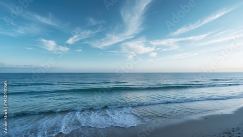 Fototapeta premium Stunning beach scene with blue sky, clouds, and sun over the ocean