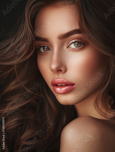 Fototapeta premium Stunning beautiful young caucasian girl with plump lips charming eyes and magnificent hair, professional studio fashion photo