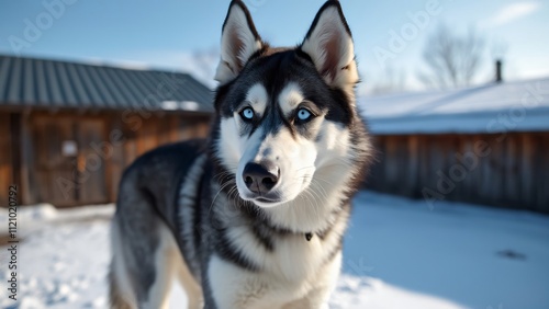 Naklejka premium Stunning Black & White Husky with Blue Eyes on Snowy Roof - Winter Dog Photography