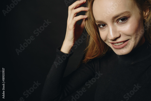 © vitleo, Obraz premium Stunning blonde girl. Long hair. Horizontal shot of astonished beautiful female model wears black turtleneck sweater, looks with bugged eyes and widely opened mouth.