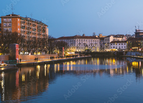 Fototapeta premium Stunning blue hour view of Darsena in the touristic district of Milan. Large...