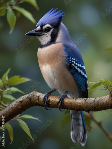 © YudhiaAsta, Obraz premium Stunning Blue Jay Perched on a Curved Branch Amidst Lush Green Foliage