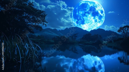 © Auon, Fototapeta premium Stunning Blue Moon over a serene lake reflecting its rare glow on the waters surface