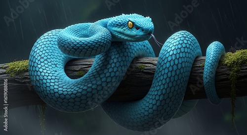 © Eti, Fototapeta premium Stunning Blue Snake with Piercing Yellow Eyes Coiled on Branch in Rainy Jungle