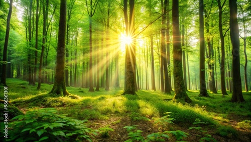 © Rafay, Fototapeta premium Stunning Blurred Green Forest Background with Gentle Sunlight Filtering Through Leaves Perfect for Nature-Themed Designs