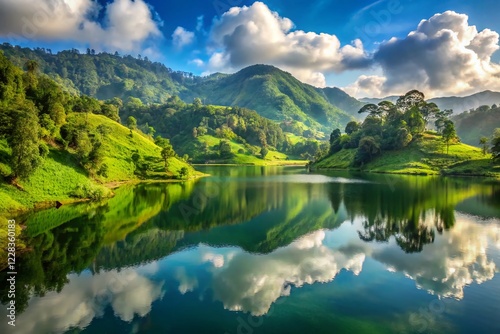 © Four888, Obraz premium Stunning Bodas Lake Landscape, Garut, Indonesia: Serene Waters & Lush Green Hills