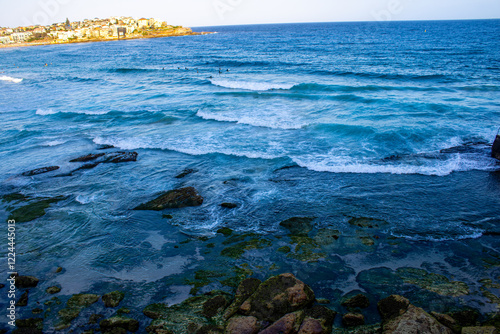 Obraz premium Stunning Bondi Beach rocks covered in vibrant green moss, with waves crashing...
