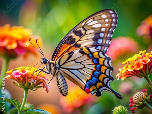 Fototapeta premium Stunning butterfly with long tail wings perched gracefully on a vibrant...