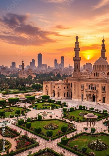 © Mohamed, Fototapeta premium Stunning Cairo sunset featuring mosques and modern city skyline views