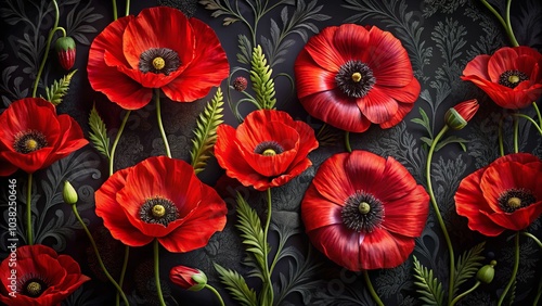 © Curie, Obraz premium Stunning Candid Photography of Poppies on Black Background, Red Neon Floral Wallpaper, Horizontal Arrangement for Vibrant Home Decor and Artistic Displays