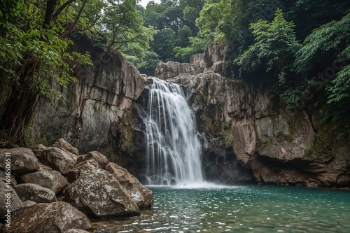 © AkuAku, Fototapeta premium Stunning cascade surrounded by lush green woodland and rocky terrain