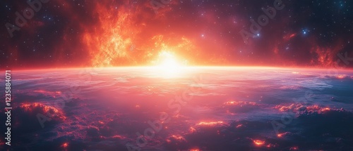 © Luminara, Naklejka premium Stunning celestial sunset outer space digital cosmic environment wide angle view