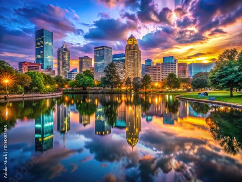 © Man888, Fototapeta premium Stunning Charlotte NC Skyline at Dusk with Colorful Lights and Reflections on the Water Surface