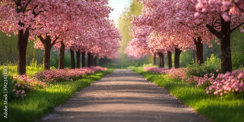 © BG_Illustrations, Naklejka premium Stunning cherry blossom trees creating a beautiful path in the spring season